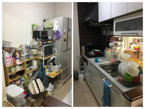 お片付け相談3回目。 今日はキッチン。 【before】 鍋は出しっぱなし。奥の引き出しは空きっぱなし(みりんの大きなボトルが引っかかってる)。床にもいろいろ置いてあるし、引き出し棚の前にいろんなものが積みあがってる・・・ 【after】 床のものがなく…